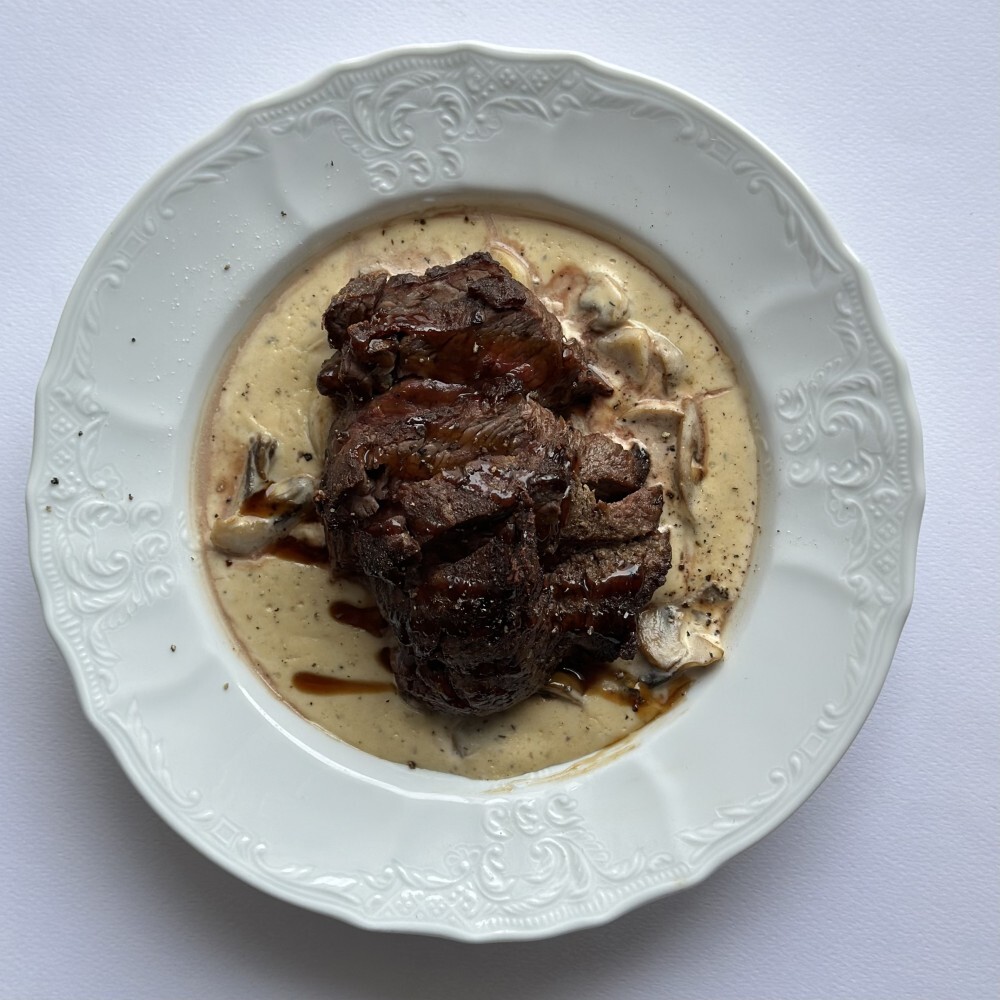 Стейк из говядины с маслом из вяленных томатов и перечным соусом